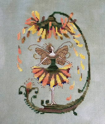 I used a conversion that I found on a Mirabilia site on the internet and changed the wings to a gold color and backstitched in brown. I think this gives her a more "autumn" look to go with the sunflower.